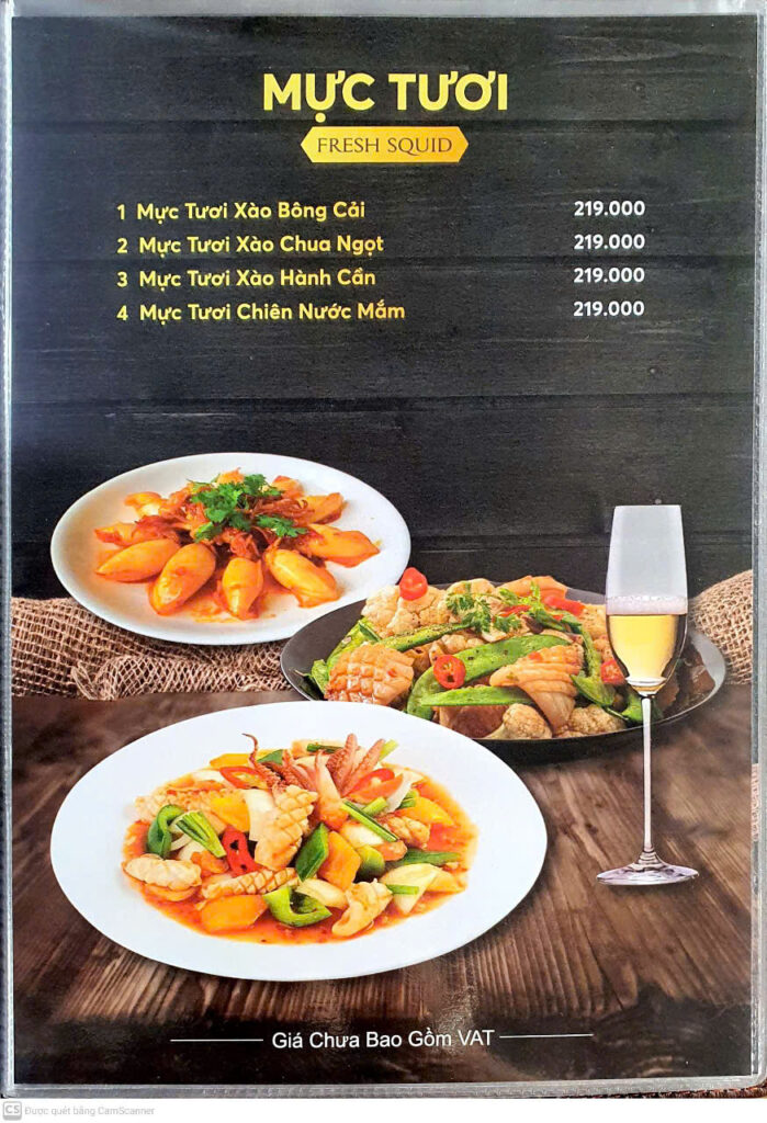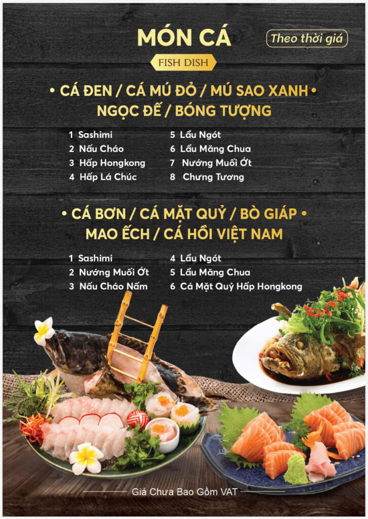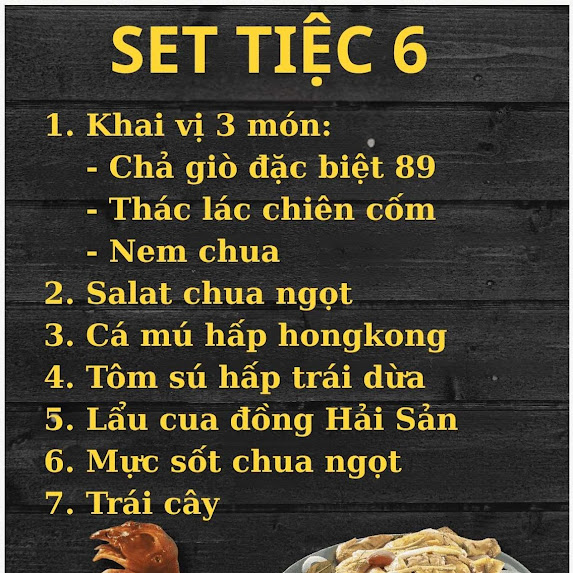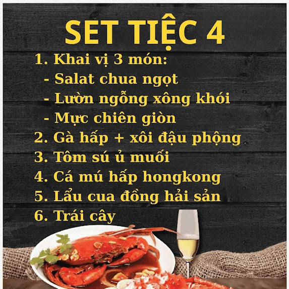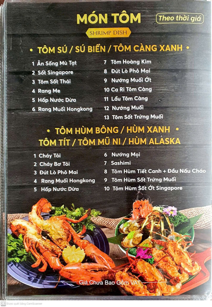 Tôm / tôm càng / tôm sú / tôm hùm: Sốt Singapore, Sốt Thái, rang me, nướng muối ớt, hút nước dừa, sashimi, tôm hùm tiết canh + đậu nấu cháo, tôm sốt trứng muối… (theo thời giá).