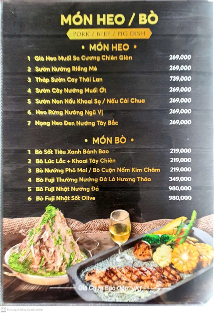 Bò: Bò sốt tiêu xanh bánh bao, bò lúc lắc + khoai tây chiên, bò nướng phô mai / bò cuộn nấm kim châm; Bò Fuji (nhiều món cao cấp)