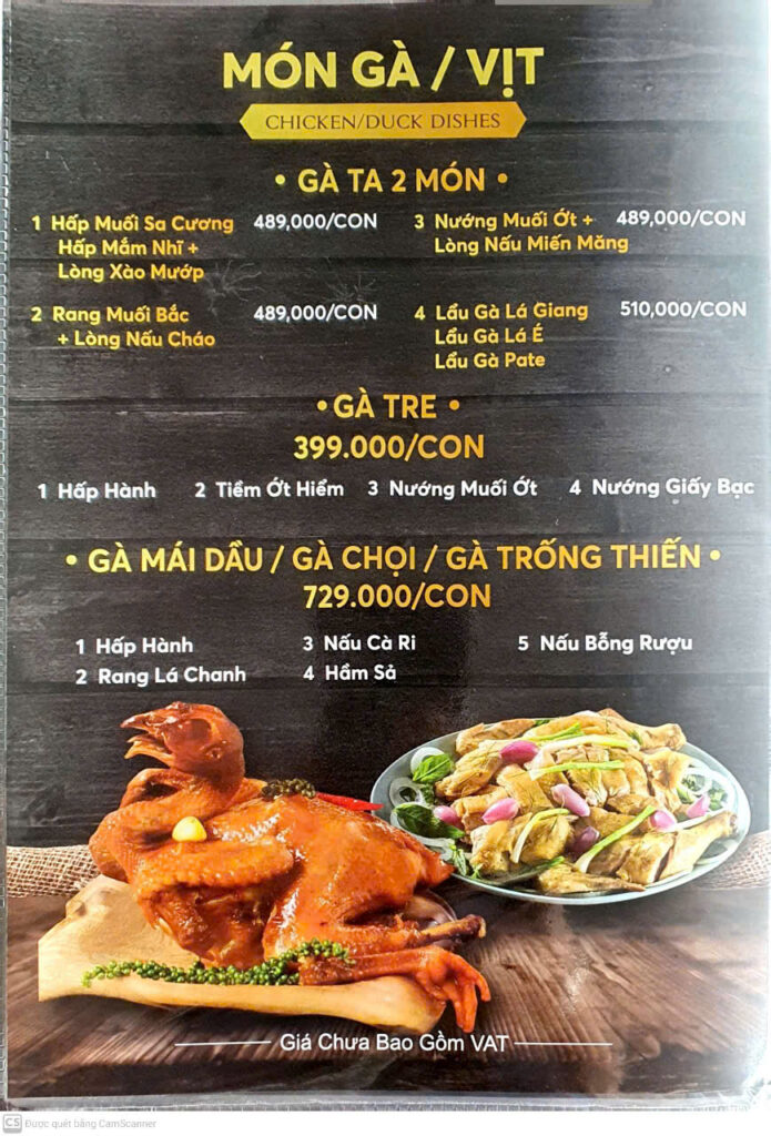 Gà Tre / Gà ta (2 món) / Gà mái dầu / gà chọi có các chế biến hấp, nướng, lẩu…