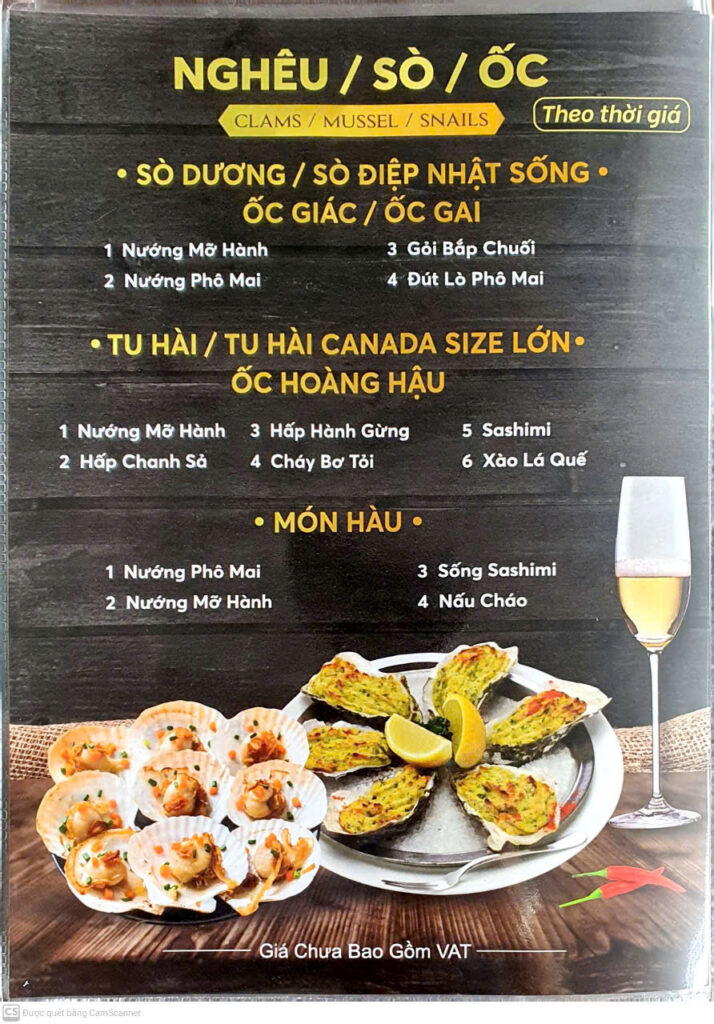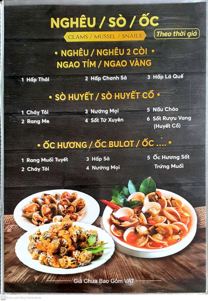 Hải sản: tôm, cua, nghêu/sò/ốc (nhiều cách chế biến theo thời giá):