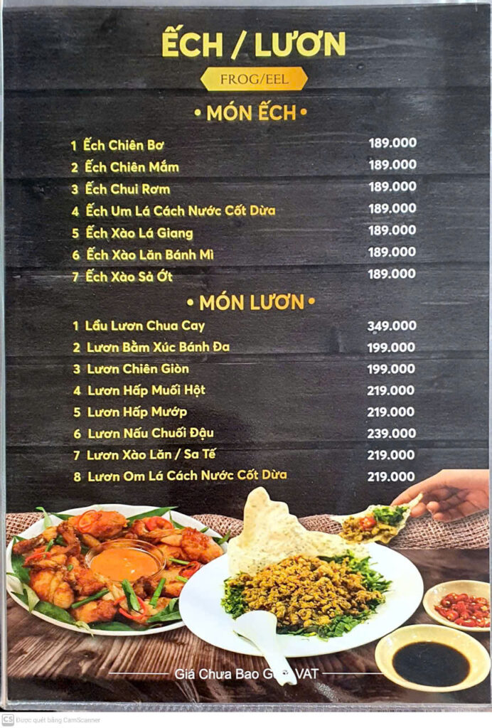 Cơm/Bún/Mì/Miến/Hủ tiếu & Món lẩu: Mì xào hải sản, cơm chiên, hủ tiếu áp chảo, các loại lẩu (Lẩu Thái, Lẩu cua đồng hải sản, Lẩu sườn non…) — giá lẩu thường