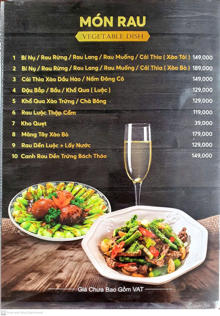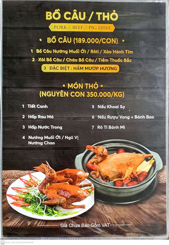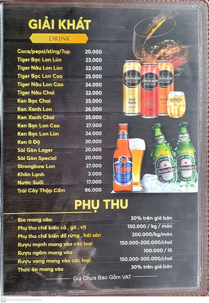 Đồ uống & phụ thu: Menu giải khát + quy định phụ thu (bia mang vào, rượu mang vào, chế biến mang vào…).